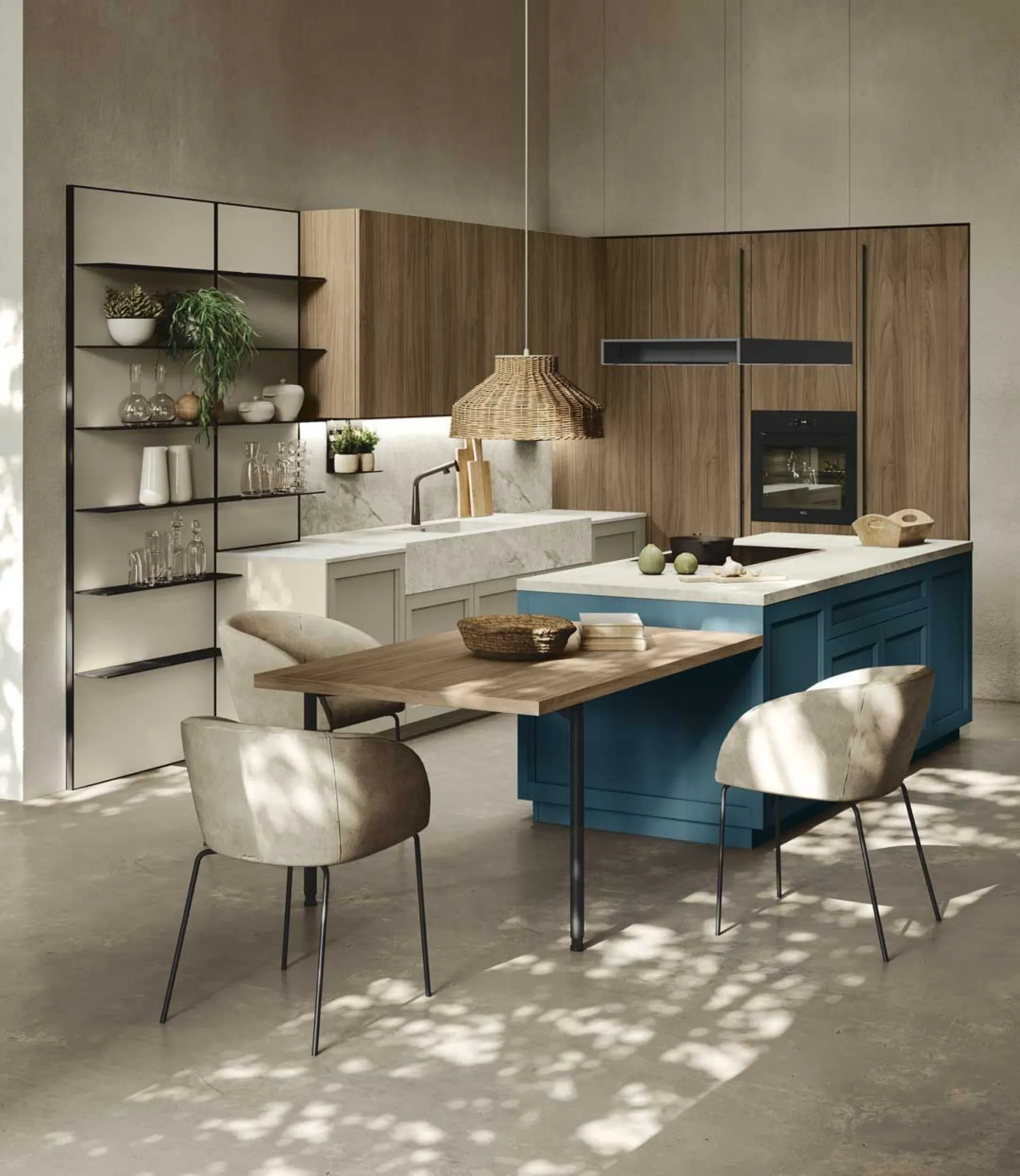 Ante, pensili, vetrine, cassetti e cestoni di varie misure si prestano ad accogliere tutti gli attrezzi del cuoco. Ognuno di essi ha la sua caratteristica come ad esempio i cassetti con decoro rigato ed il vetro con riga trasparente bronzo sulle vetrine. Si utilizzano in gran parte piani di lavoro Neolith®, un materiale pregiato e all’avanguardia per garantire, oltre all’impatto estetico anche lunga durata e comodità nella pulizia quotidiana.
