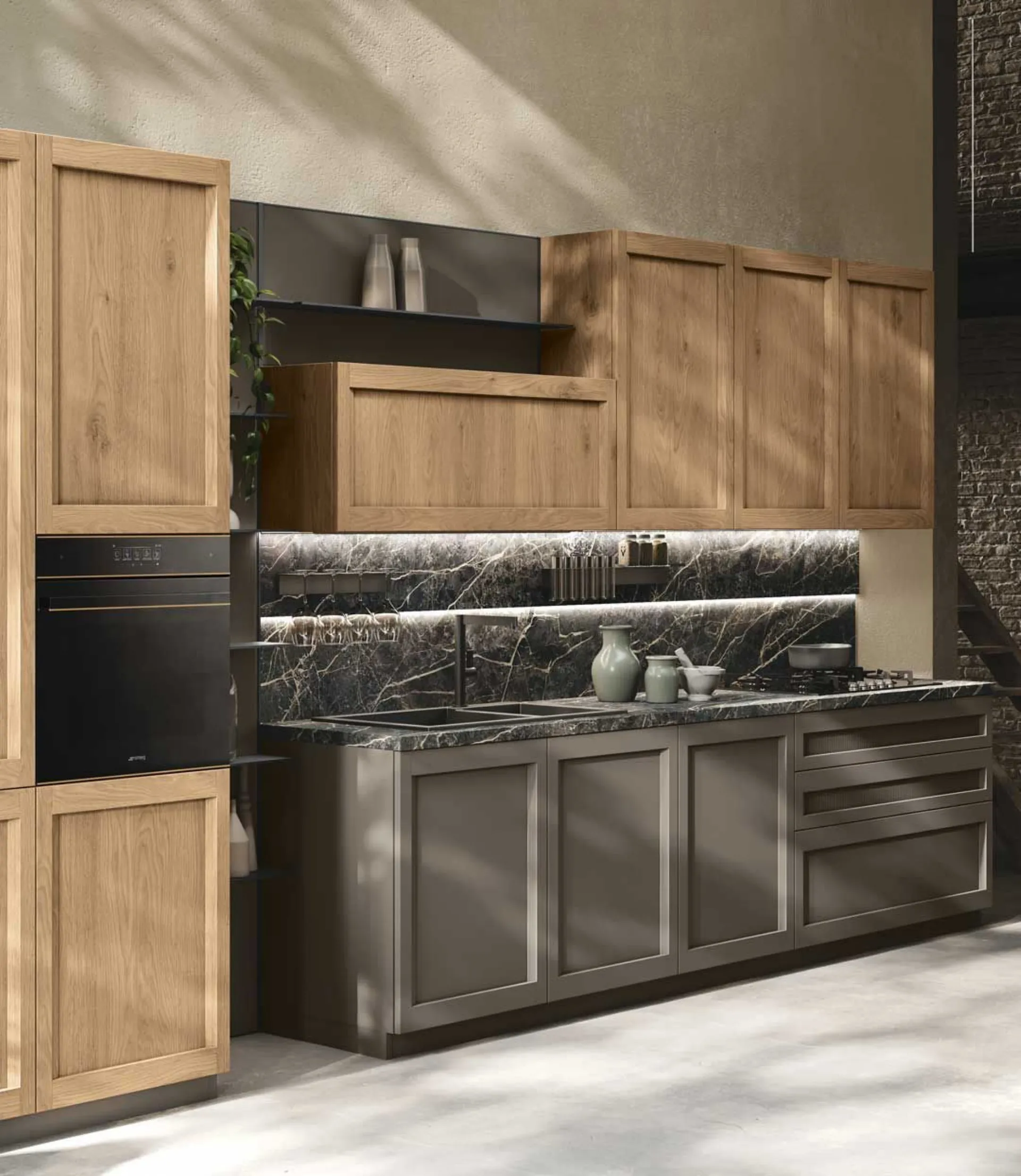 Emergono così cucine che incarnano un inconfondibile gusto, capaci di dare vita a ambienti singolari. Questo stile, che si muove tra la solida tradizione del legno massello e il design delle linee contemporanee, si traduce in un programma di arredamento unico nel suo genere, rappresentando una cucina che abbraccia il meglio di entrambi i mondi: il classico e il contemporaneo.